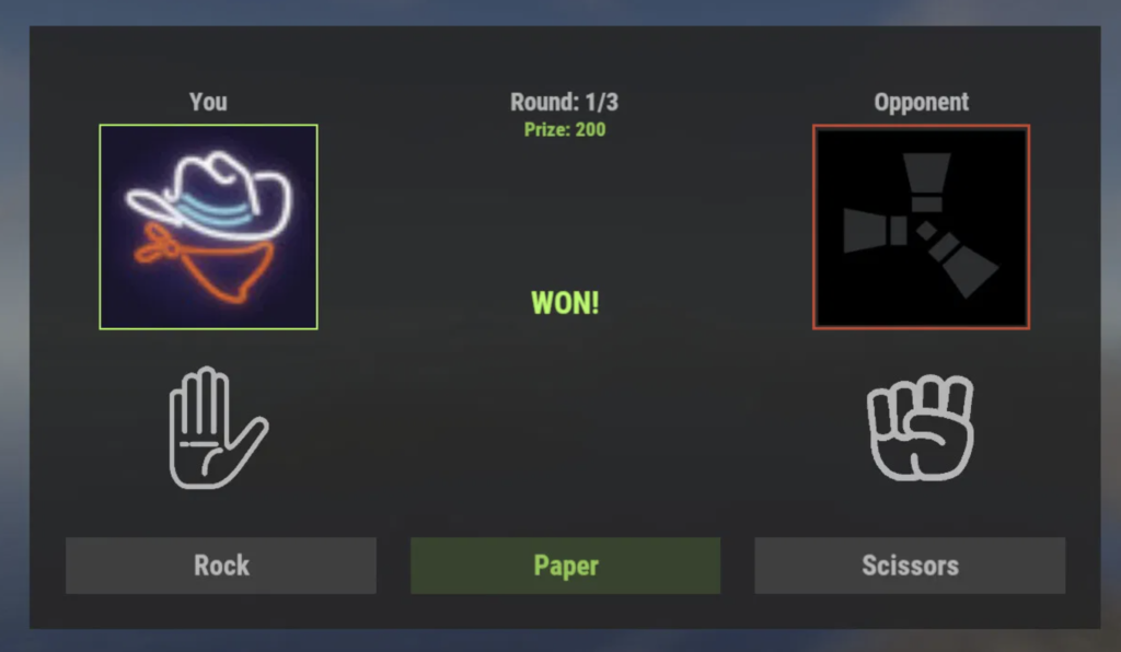 Rock Paper Scissors gives players the ability to gamble with each other, in a winners takes all scrap fest !!! Simply have some scrap on you, and make sure your opponent does too and initiate the best of 3 game. Each player has 15 seconds to lock in their choice or it will auto select it. Type in chat: